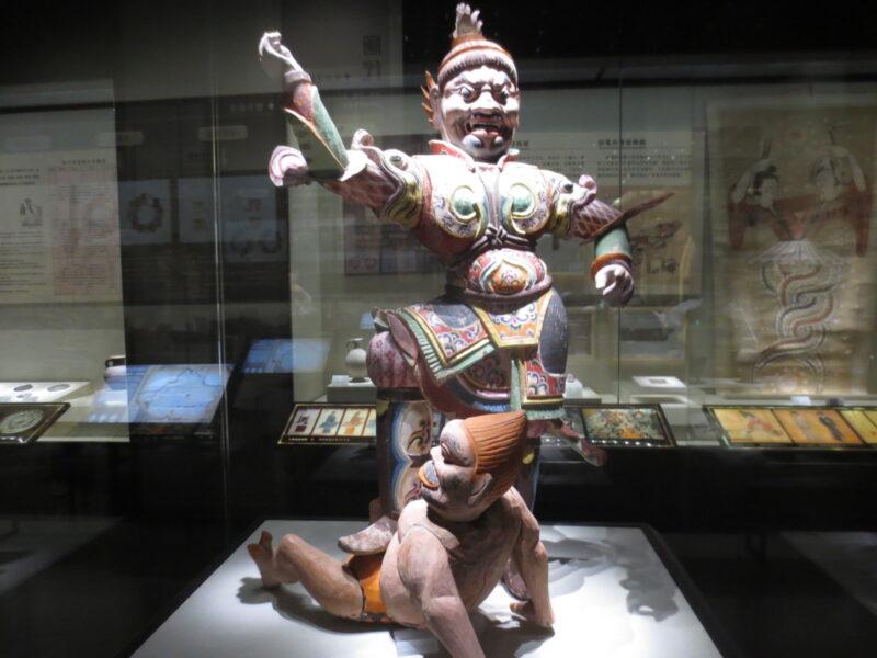 彩絵天王踏鬼木俑。鬼が天王に踏まれている。この天王は敦煌の壁画や石窟などでもよく見かける。
