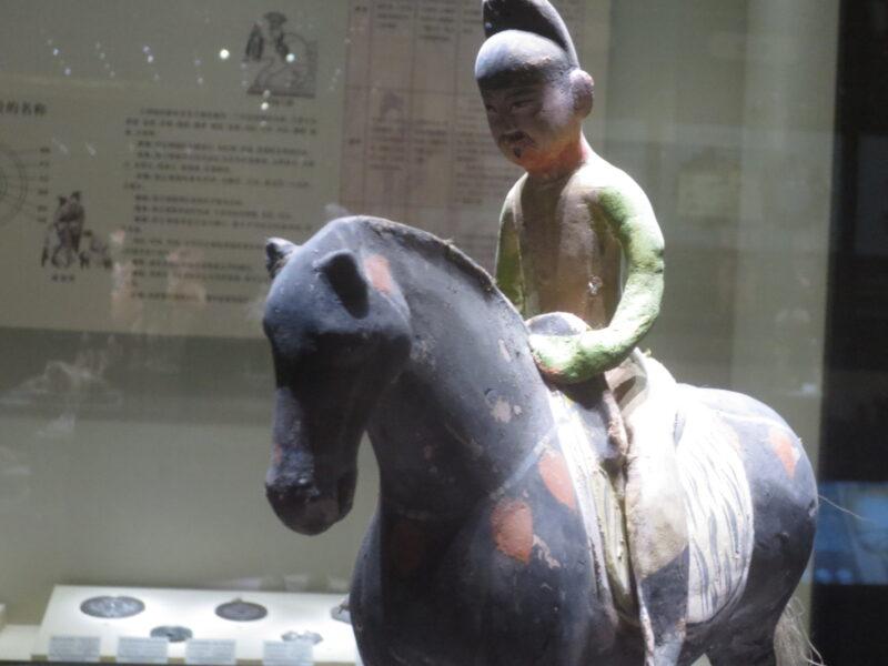 アスターナ古墳群から発掘された彩色騎馬男泥俑。唐代のもの。
