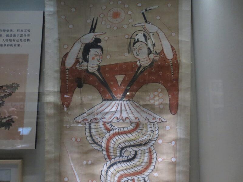 伏義女媧図。この図は、この後行ったトルファン博物館でも見た。伏義と女媧は中国古代神話に出て来る神で、夫婦又は兄妹とされる。伏義は中国神話に登場する神又は伝説上の帝王。女媧は中国神話に登場する人類を創造した女神。二人は蛇身人首の姿で表され、下半身の蛇尾は絡まっている。伏義は左手に金尺を持ち、女媧は右手に金差を持っている。二人の頭上には太陽が、尾の下には月が描かれ、二人の周囲には星を表す丸い円が描かれている。