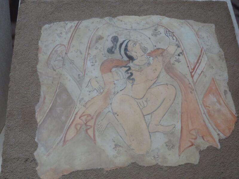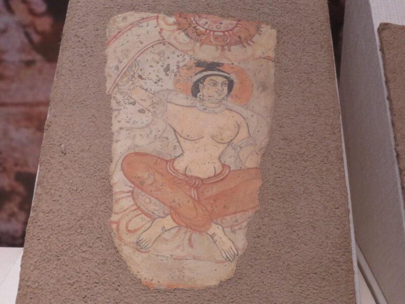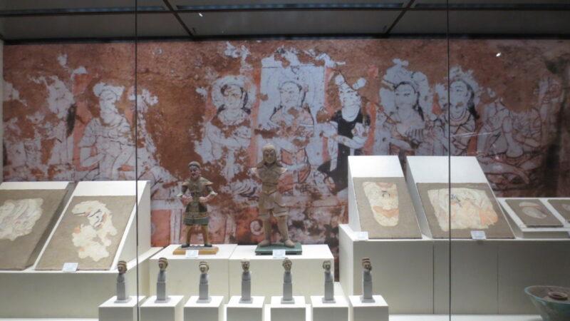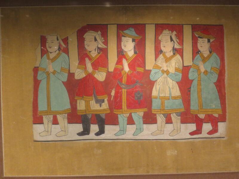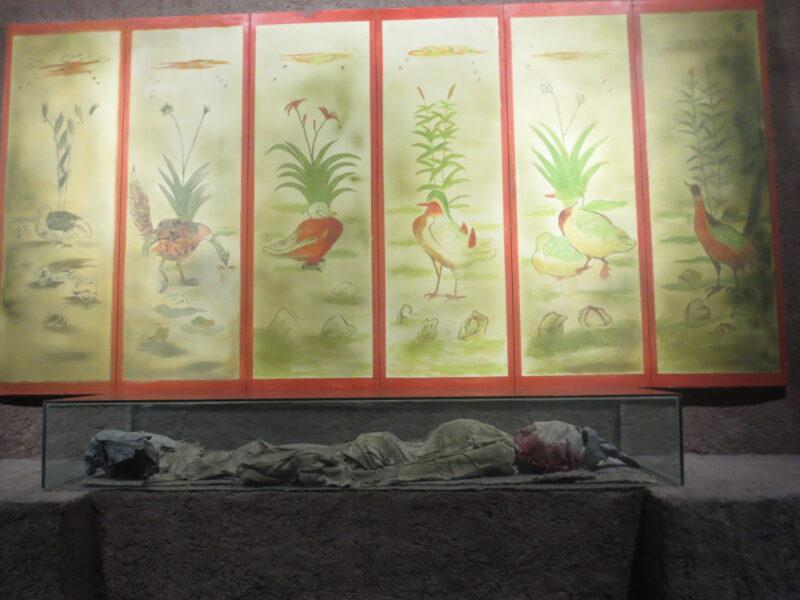 こちらはアスターナ古墳群215墓の墓室に描かれた花鳥風月図。その前にはミイラが展示されているが、近くで見れない構造になっている。