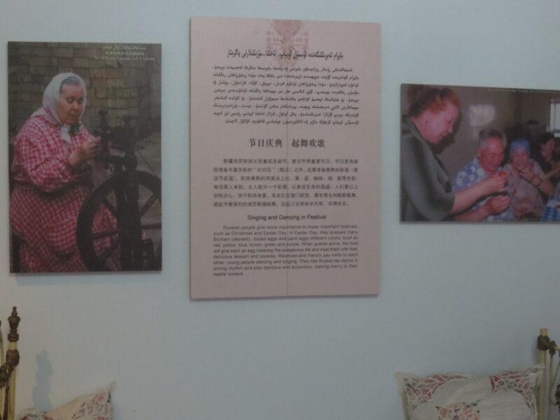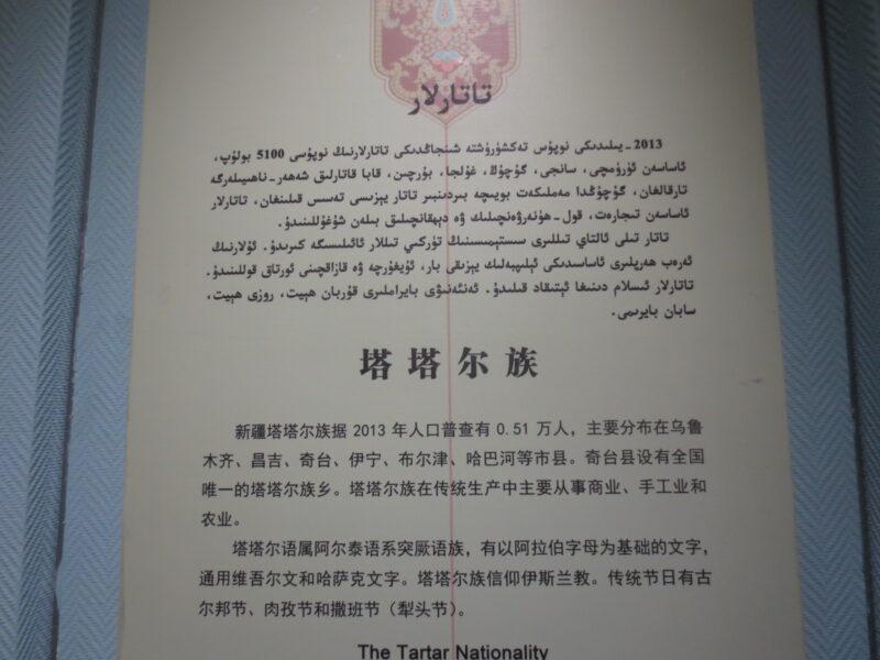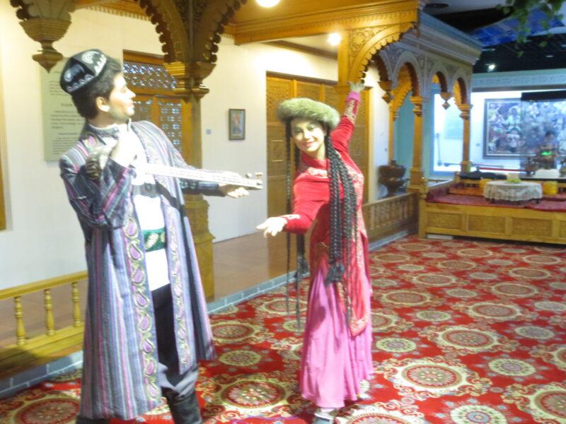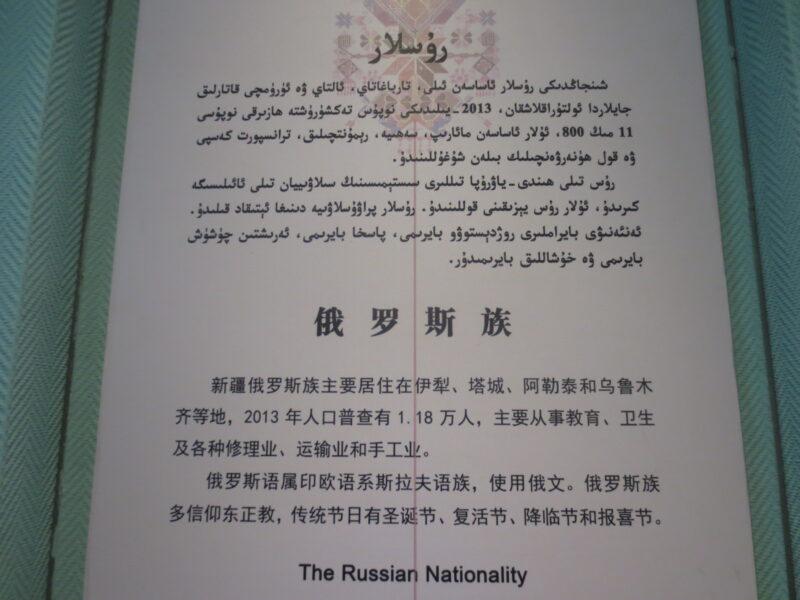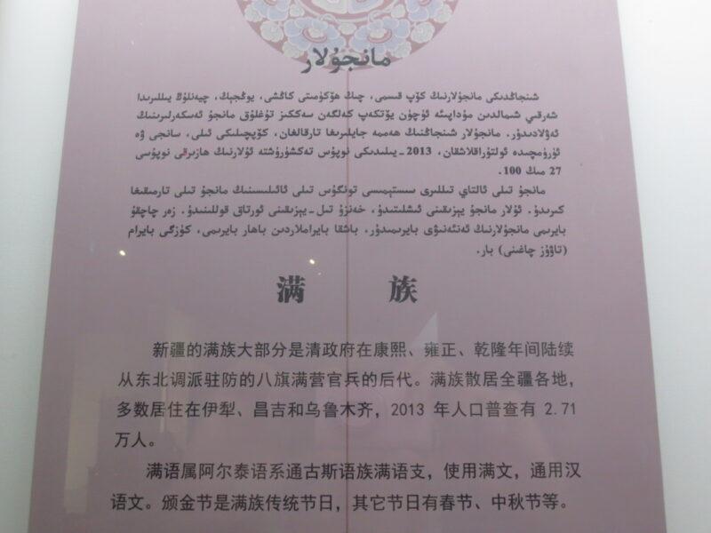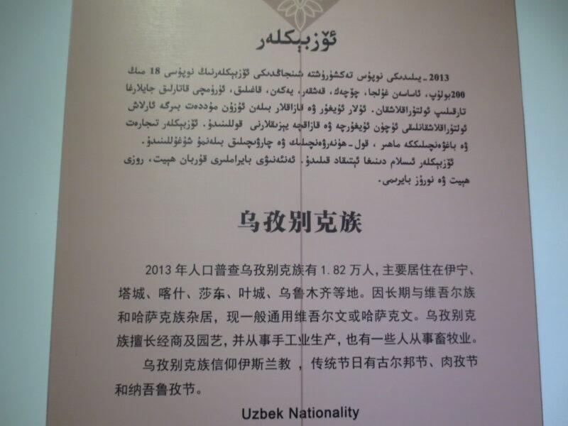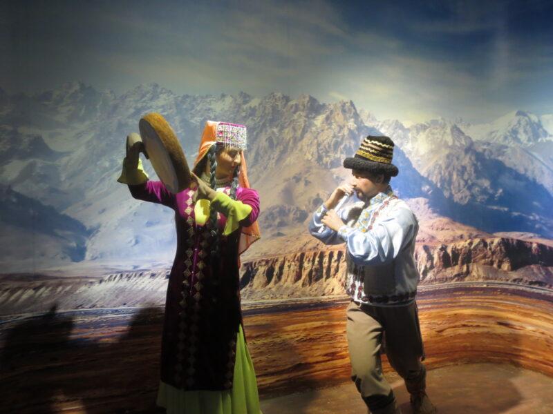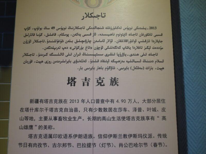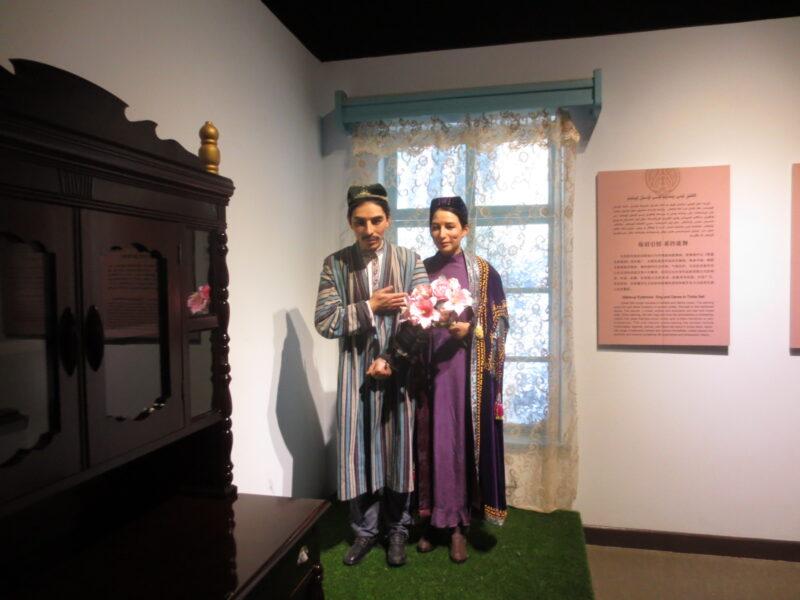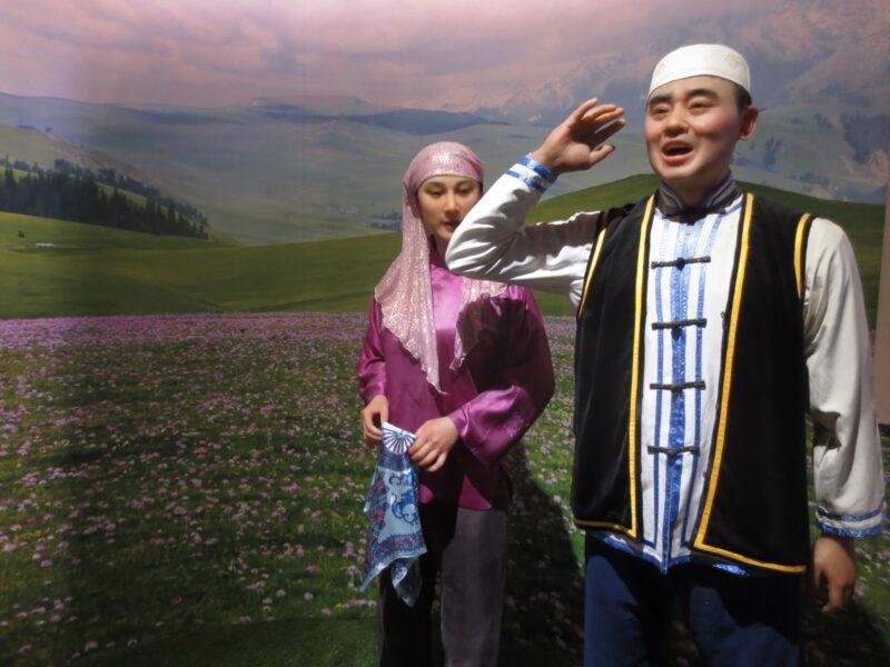 民族民俗資料陳列館では、新疆ウイグル自治区に住む12の少数民族の紹介展示があった。初めにウイグル族。統計年度にもよるが、新疆ウイグル自治区で約900万人近く居住しており、人口比率46%で最も多い。
