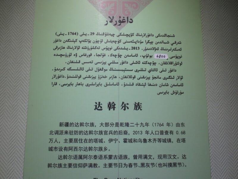 ダウール族。もとは満州に居住していた民族で、シベ族と同じく乾隆帝時代に西域防衛のため、新疆へ移住してきた。2013年時点で人口約6,800人。