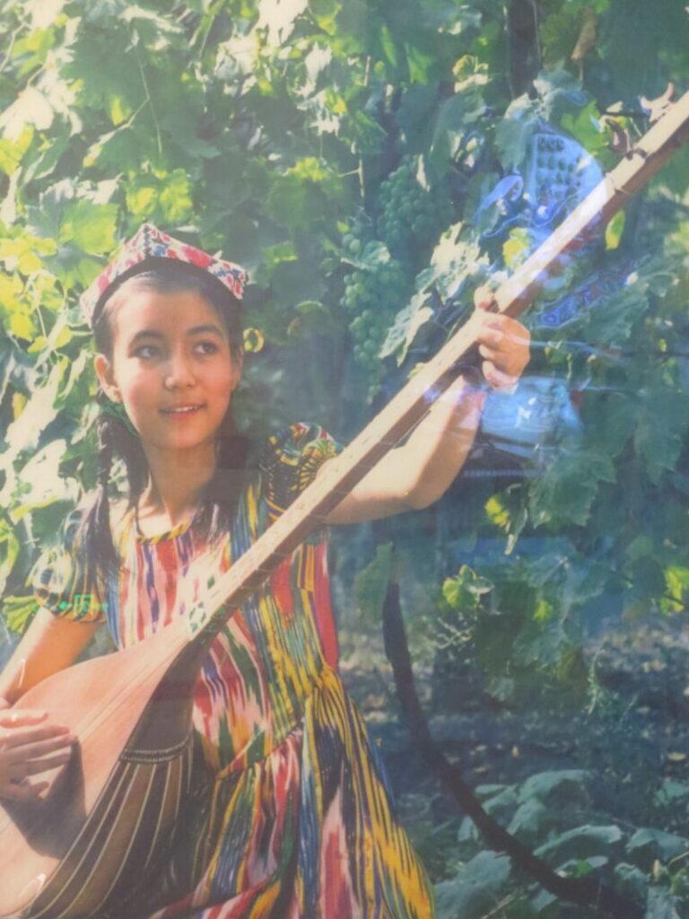 タジク族の写真。タジク族とは説明が書かれていなかったが、タシュクルガンへ行った事があり、この服装の文様からタジク族服装の図柄であると分かる。