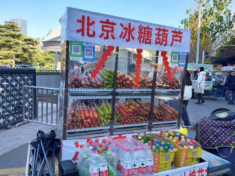 北京名物の糖葫芦が売られていた。夏のお祭りの際に売っている杏あめを凍らしたようなもの。歯にくっつくので自分は好きではない。