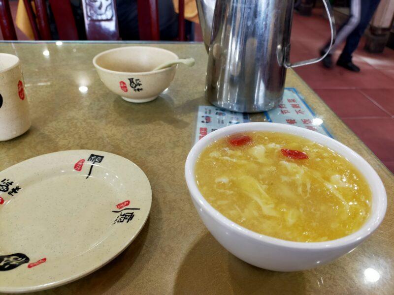 はじめに「玉米羹」が来た!どろどろとしたコーンとたまごのスープで、なんか懐かしい味がする。昭和の町中華にあったたまごスープに似ているかも。今はこの手のスープは日本では食べれないと思う。