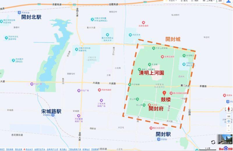 開封市街地の地図。市中心部は20年程前に再建された城壁で囲まれている。