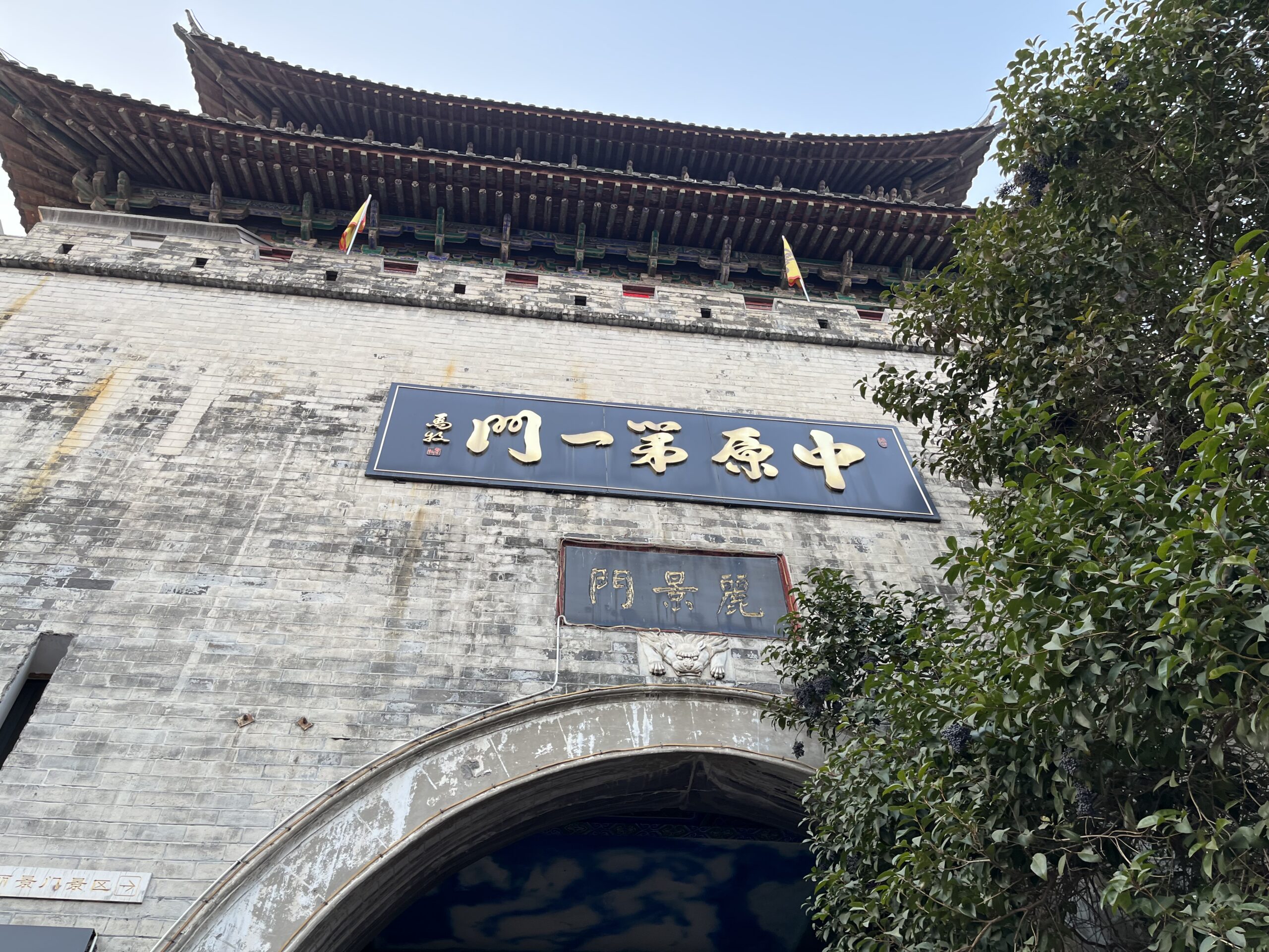 門の内側から上を眺めてみた。「中原第一門」の額縁がある。
