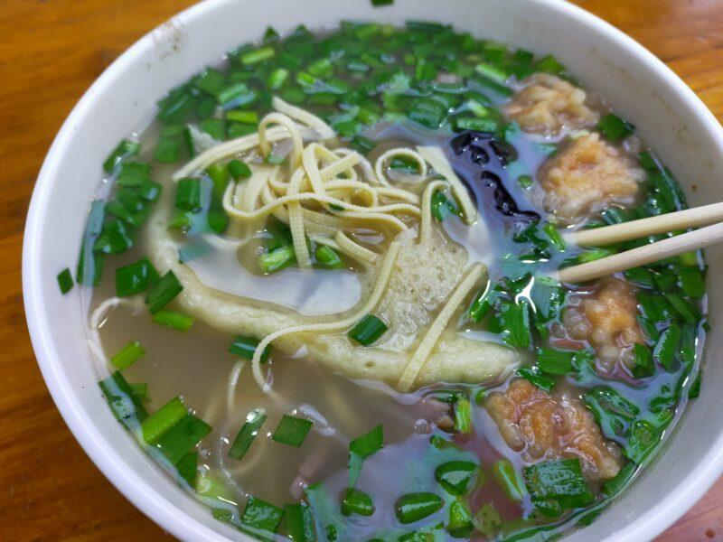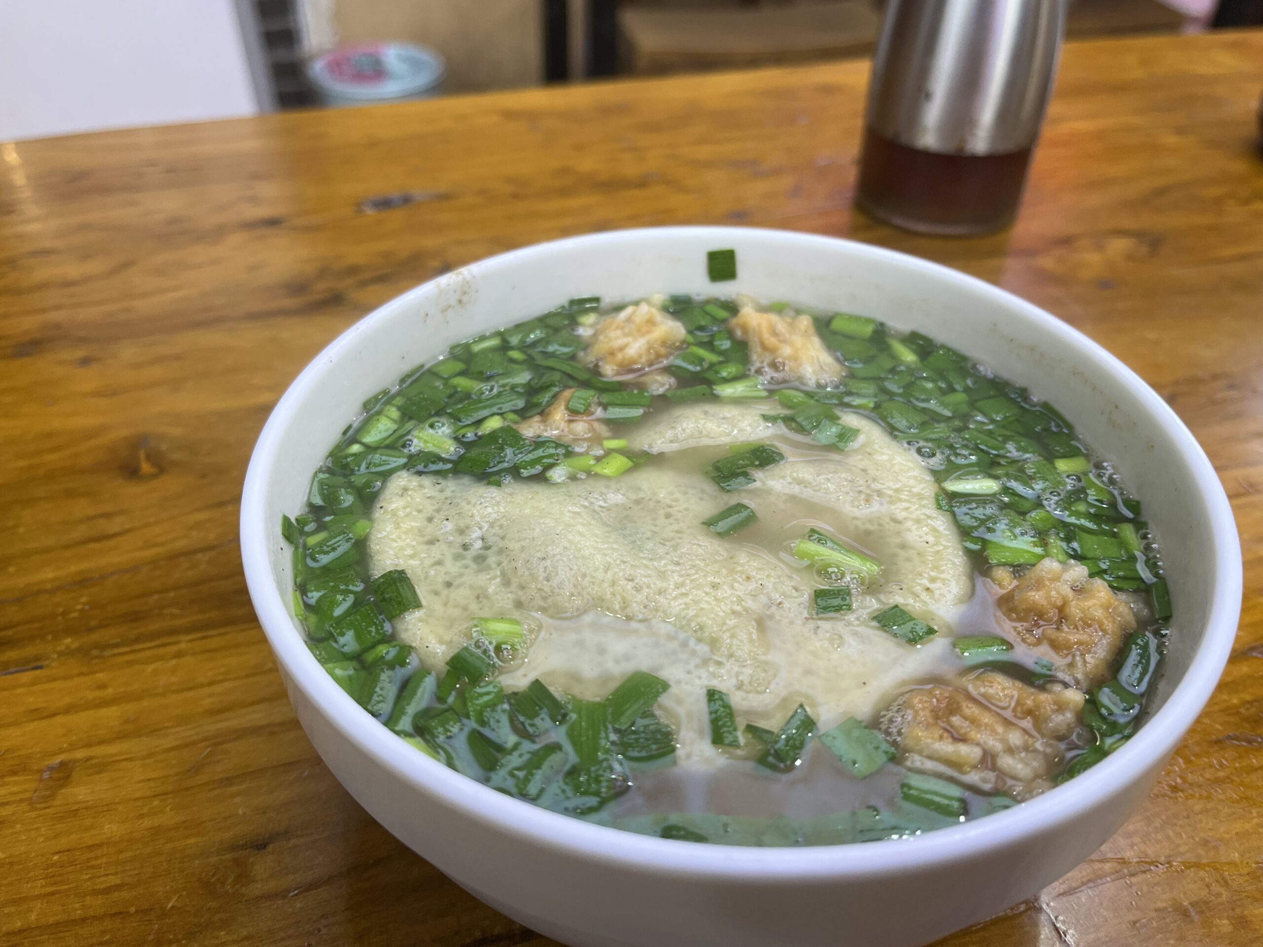 これが「不翻湯」である(15元)。上に乗っているのは緑豆の生地を薄く焼いたもの。スープ料理の一種である。