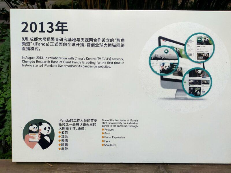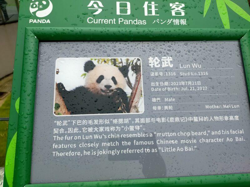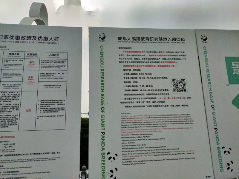 開園時間の案内。夏季は朝7:30に開園するが、1日のパンダの活動時間は早朝なので、ここへは朝一に来るのが必須である。チケットは55元で、前回来た時と値段が変わっていない(10年以上前)。入場制限で入れないと困るので、3日前に微信で購入済。