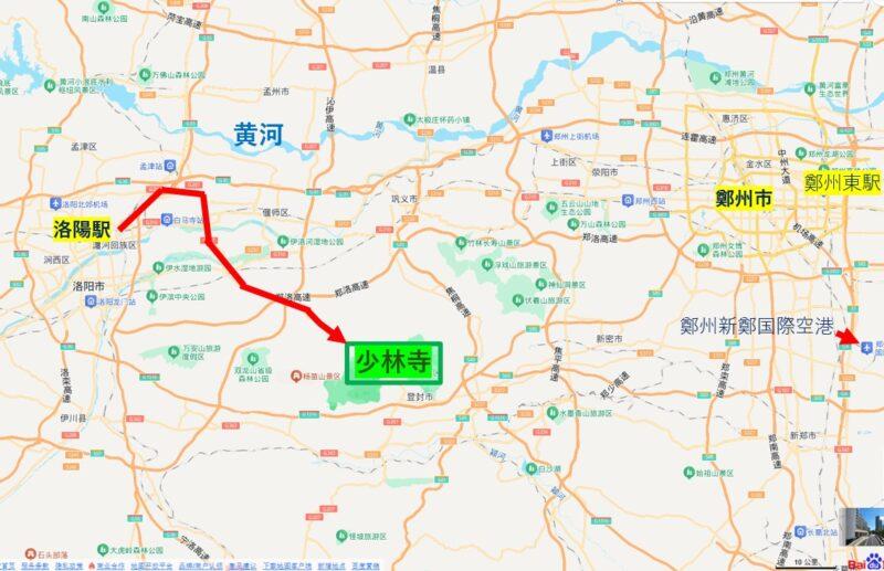 洛陽から少林寺までのバスのルート。一般道を約130㎞ほど走り、2時間近くかかる。タクシーで高速を使って行けば、1時間で到着すると思う。その場合、費用は交渉になると思うが、高速代込みで200元~300元で行けると思う。