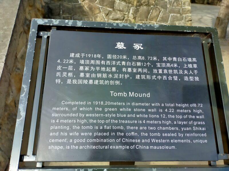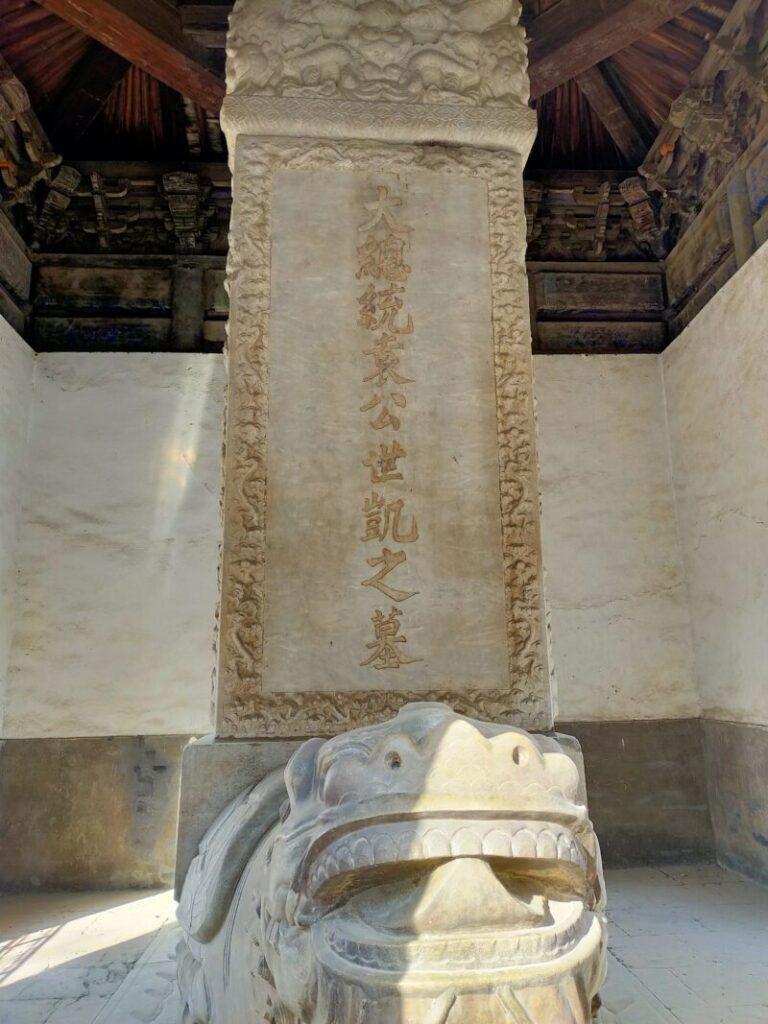 碑には「大総統袁公世凱之の墓」と刻まれ、高さ5.5mある。北洋軍閥大総統・徐世昌の筆によるもの。