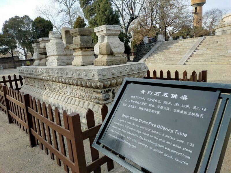 墓塚の前には「青白石五供卓」という、5台の石が積まれた仏壇がある。