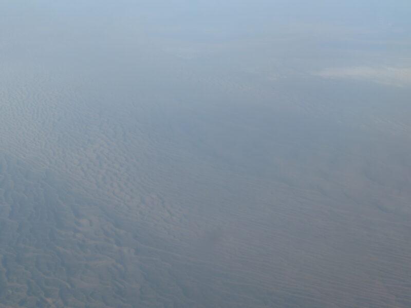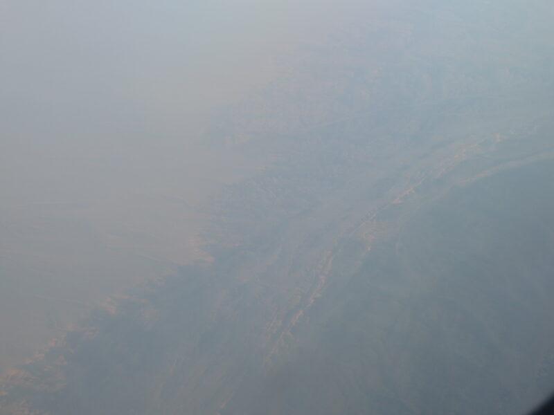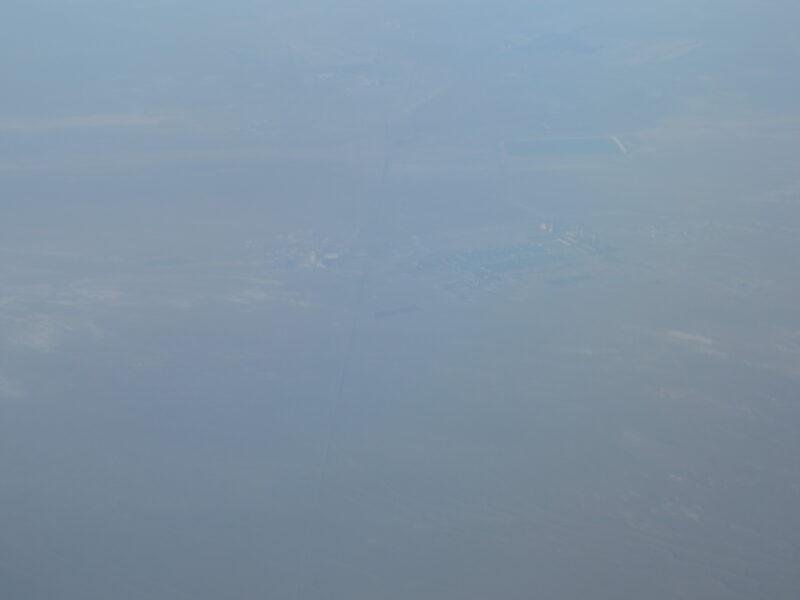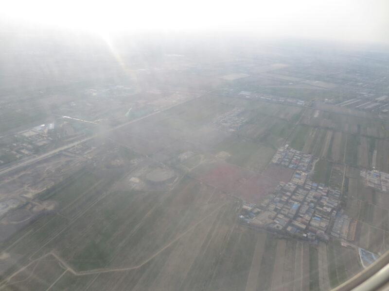 湖が見えるが、どこの湖かは分からない。おそらく青海省上空を飛行中と思うが、青海省には数多くの塩湖がある。写真では分かりにくいが、光の反射でこれらの塩湖は表現できない色で輝いている。