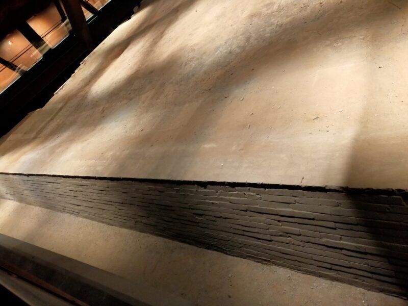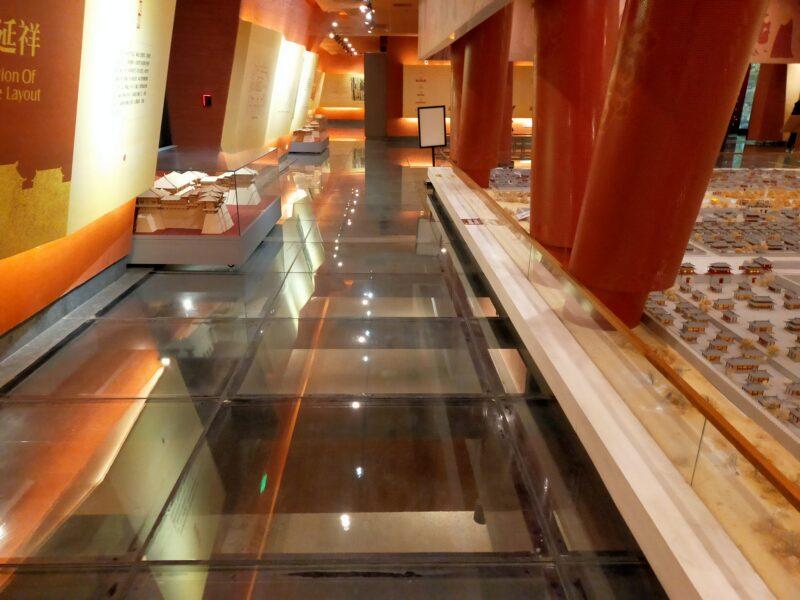 応天門の発掘現場が見えるようにして、その上に現物を再建している。
