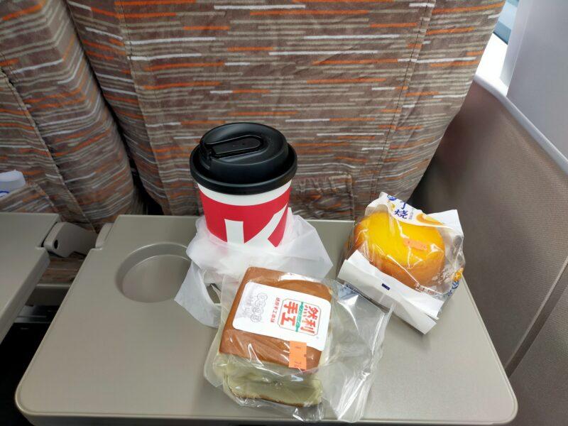 車内で朝食を食べる。売店で購入したパンとK Coffee。